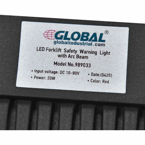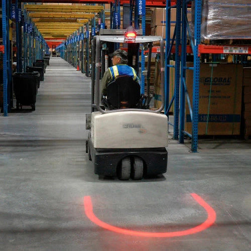 The LED Safety Warning Spotlight mounts to a forklift or other moving vehicle, projecting a sharp, bright red U-shaped arc perimeter beam onto the floor surface. The bright light on the floor is clearly visible to pedestrians, machines and vehicles in the area, regardless of the ambient noise, alerting them to the nearby presence of the forklift. Traditional audio back up alarms can blend into ambient noise in the building and pedestrians can become immune to the audio warning. Safety Light is intended to be mounted onto the rear of a forklift, not the front.