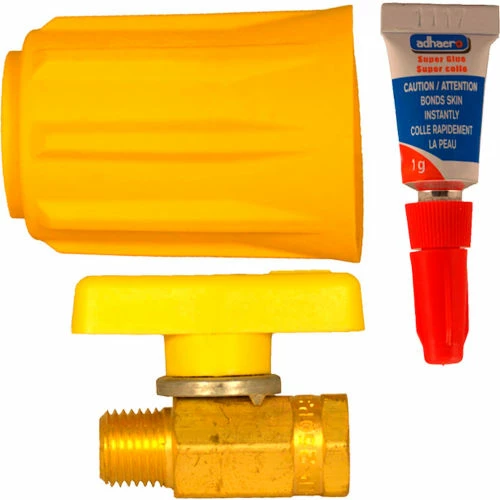 Changing an LPG (Liquid Petroleum Gas, otherwise known as Propane) cylinder can injure a forklift operator if the seal in the cylinder valve has failed, as a defective seal can allow the liquid propane gas to spray over the hand or face of the operator. Since liquid propane vaporizes quickly (-44ยฐ F or -42ยฐ C), it will cause extreme frostbite when in contact with the skin. The solution is to place this shut-off valve on the hose, preventing the liquid propane from coming back onto the operator. When closed, the valve shuts off LP Gas to the coupler preventing gas from coming back through the hose if the seal fails. This is important, as most LPG forklift cylinders are rented and the operator does not know the condition of the seal or age of the cylinder without rigorous inspection. When the valve is open, the high-visibility shut-off handle covers the coupler so that the valve cannot be disconnected. Quick and easy installation.