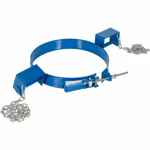 This Tilting Drum Ring transports up to 1200 pounds with your fork truck and the Tilting Drum Ring. Pivoting fork pockets allow you to manually rotate steel drum to dispense light materials. Designed to handle 30 gallon drums. 5-1/4″W x 2-7/8″H fork opening. To use, slip the band over the drum and tighten the lock to secure the band around the belly of the drum. Features powder coated steel construction with a blue finish.