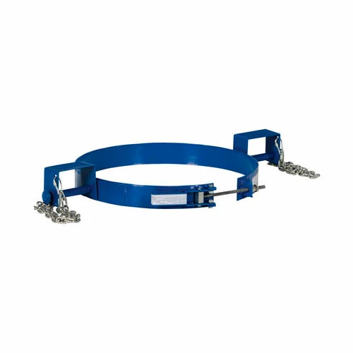 This Tilting Drum Ring transports up to 1200 pounds with your fork truck and the Tilting Drum Ring. Pivoting fork pockets allow you to manually rotate steel drum to dispense light materials. Designed to handle 55 gallon drums. 5-3/4″W x 2-7/8″H fork opening. To use, slip the band over the drum and tighten the lock to secure the band around the belly of the drum. Features powder coated steel construction with a blue finish.